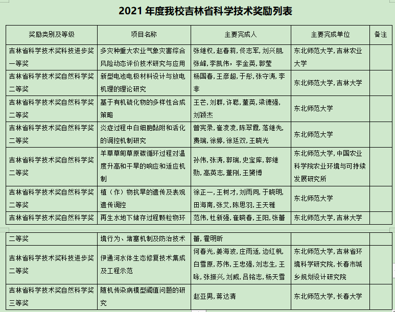 11月,吉林省科技厅公布了《关于2021年度吉林省科学技术奖励的决定》,我校9项科技成果榜上有名,其中一等奖1项、二等奖7项、三等奖1项,成果覆盖数学、物理、化学、生物、环境、农学、基础医学等多个学科领域。我校获奖成果中,环境学院张继权教授主持完成的“多灾种重大农业气象灾害综合风险动态评价技术研究与应用”荣获科学技术进步奖一等奖。